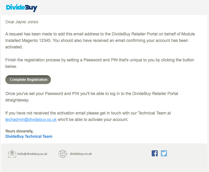 You’ll then receive a confirmation email once you’ve filled out your details and set up your pin and password. You can now login to your new DivideBuy Retailer Portal.