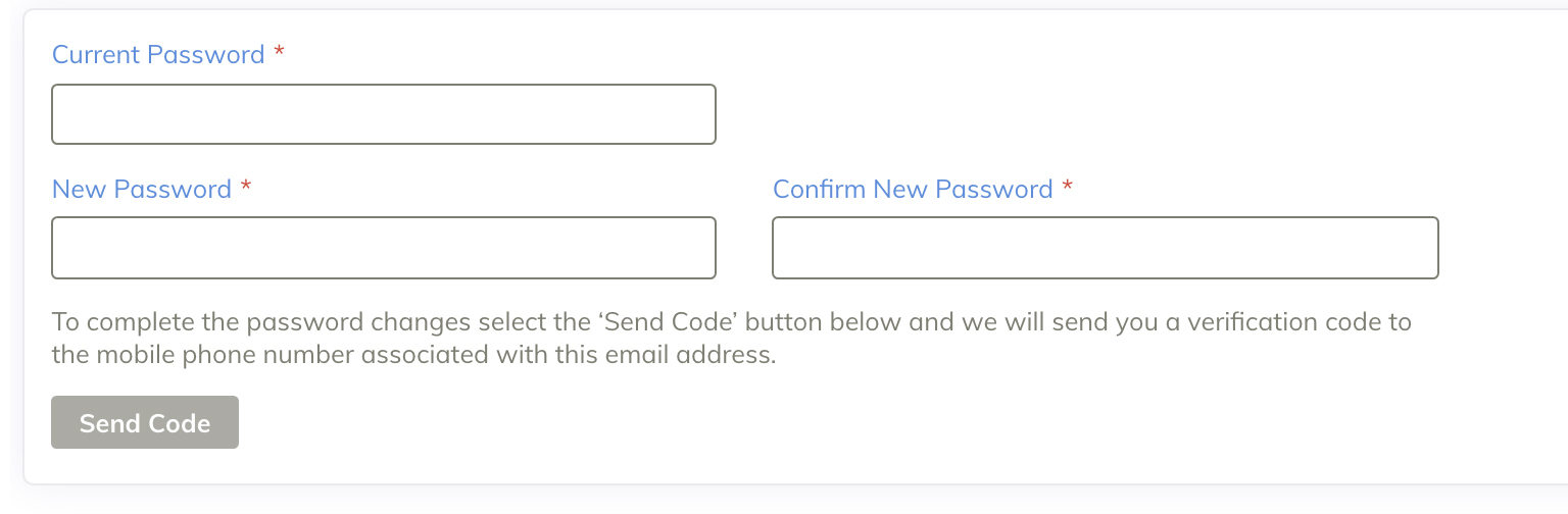 Once you have entered all your details, select “Send Code” at which point a verification code will be sent to the phone number registered with your User Profile.