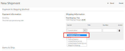 Step 1 – Locate the order and go to the order details page. Select the Ship button in the order and under the Shipping Information section select ‘DivideBuy Custom’