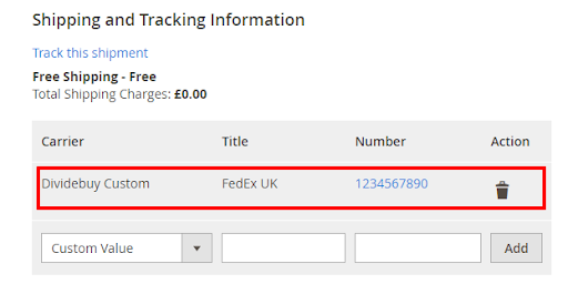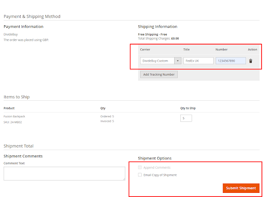 Step 4 – When Submit Shipment is selected, the details will be saved on DivideBuy’s system and the information will be saved as per the screenshot below against the order