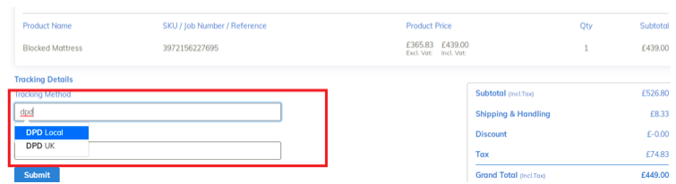 Step 3 – Enter the courier name within the Tracking Method field – as you type the courier name in a selection of approved retailers will be displayed in a dropdown list.