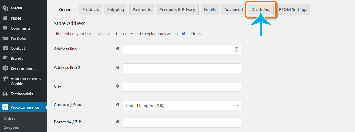 • With the Plugin activated, navigate to ‘WooCommerce’ and then ‘Settings’. Here you will notice a new tab has been added, titled ‘DivideBuy’. This is where you will enter the configuration for your DivideBuy installation.