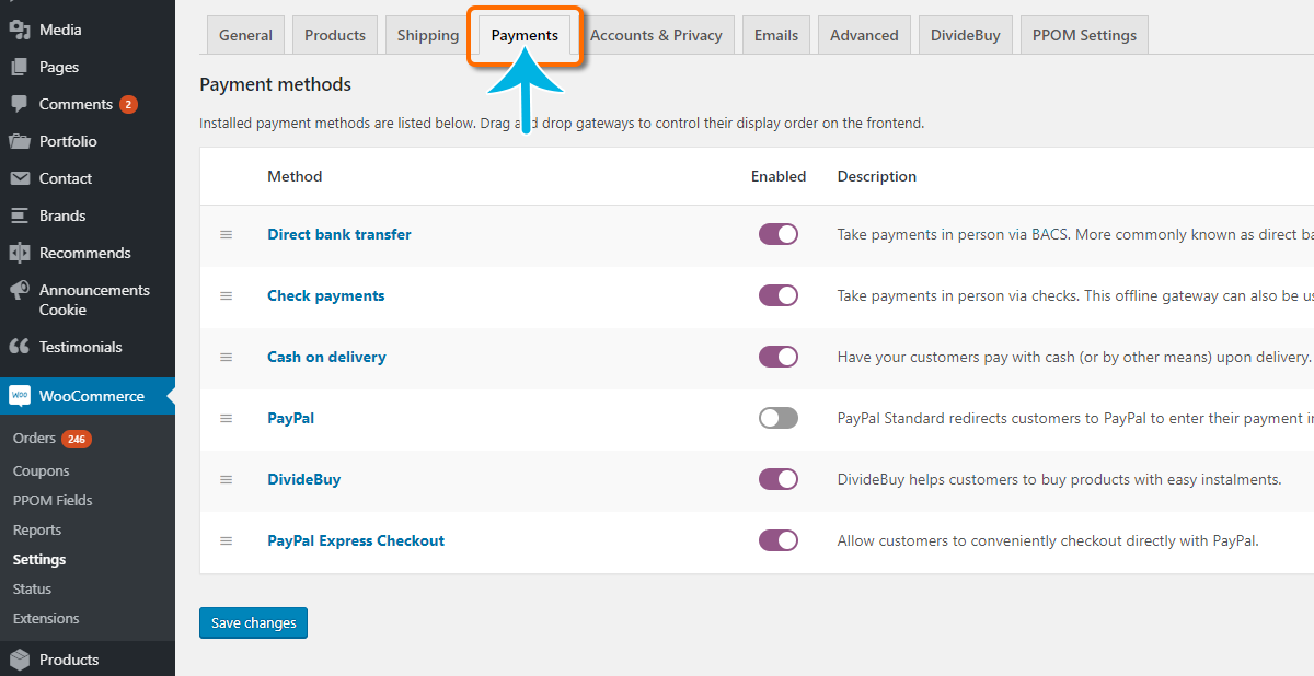 • Select the ‘Payments’ tab of your WooCommerce Settings area.